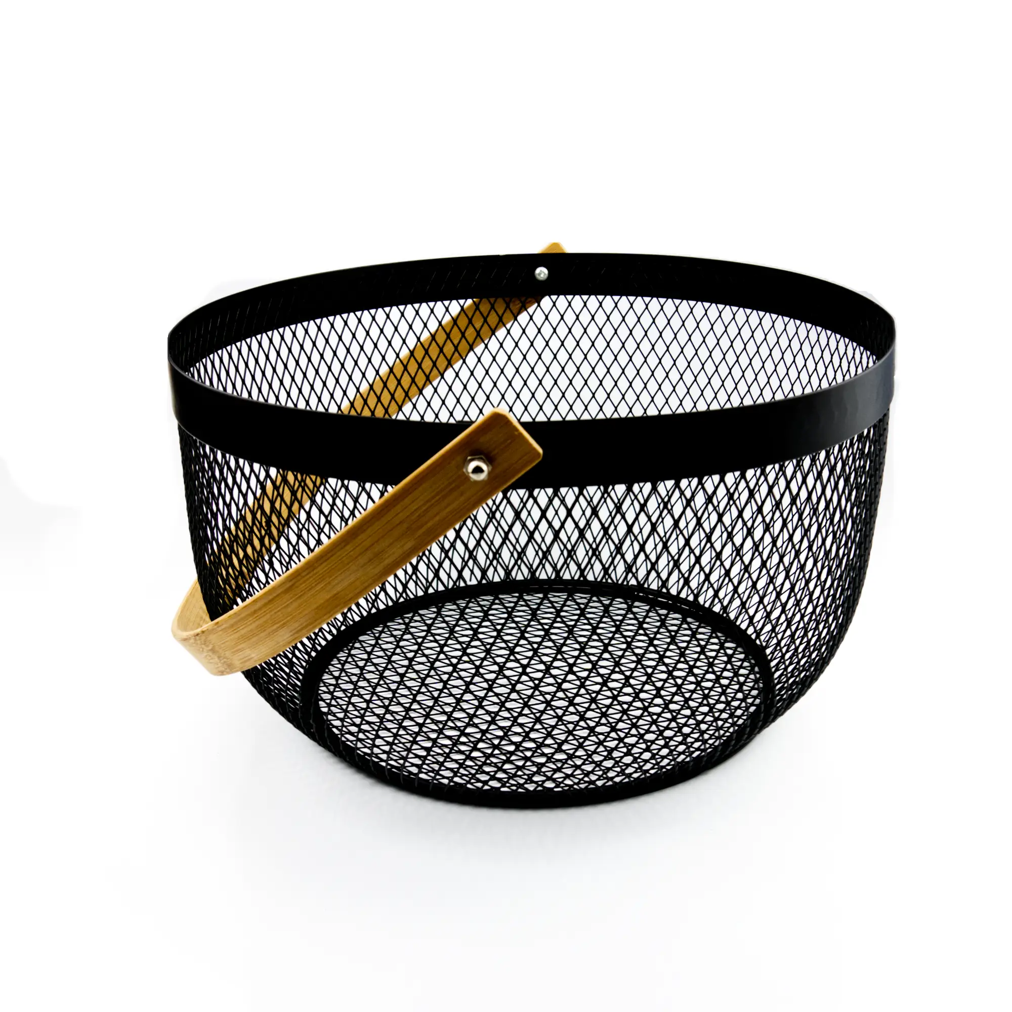 Elegants apaļš metāla grozs ar rokturi melnā krāsā – stilīgs un praktisks risinājums augļu, dārzeņu vai dekoratīvu priekšmetu glabāšanai uz galda vai plaukta.