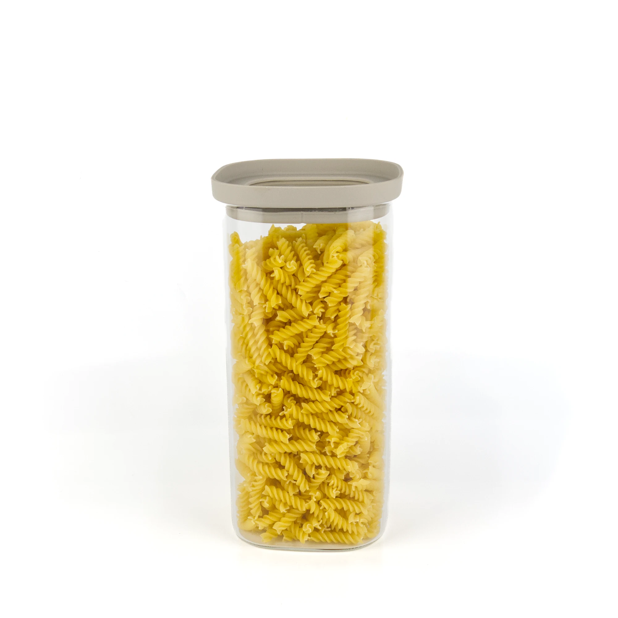 Stikla pārtikas trauks 1.6L ar silikona vāku nodrošina līdzsvaru starp kompaktumu un ietilpību. Tas ir piemērots makaroniem, auzu pārslām, miltiem, pupiņām un citiem sausajiem produktiem.