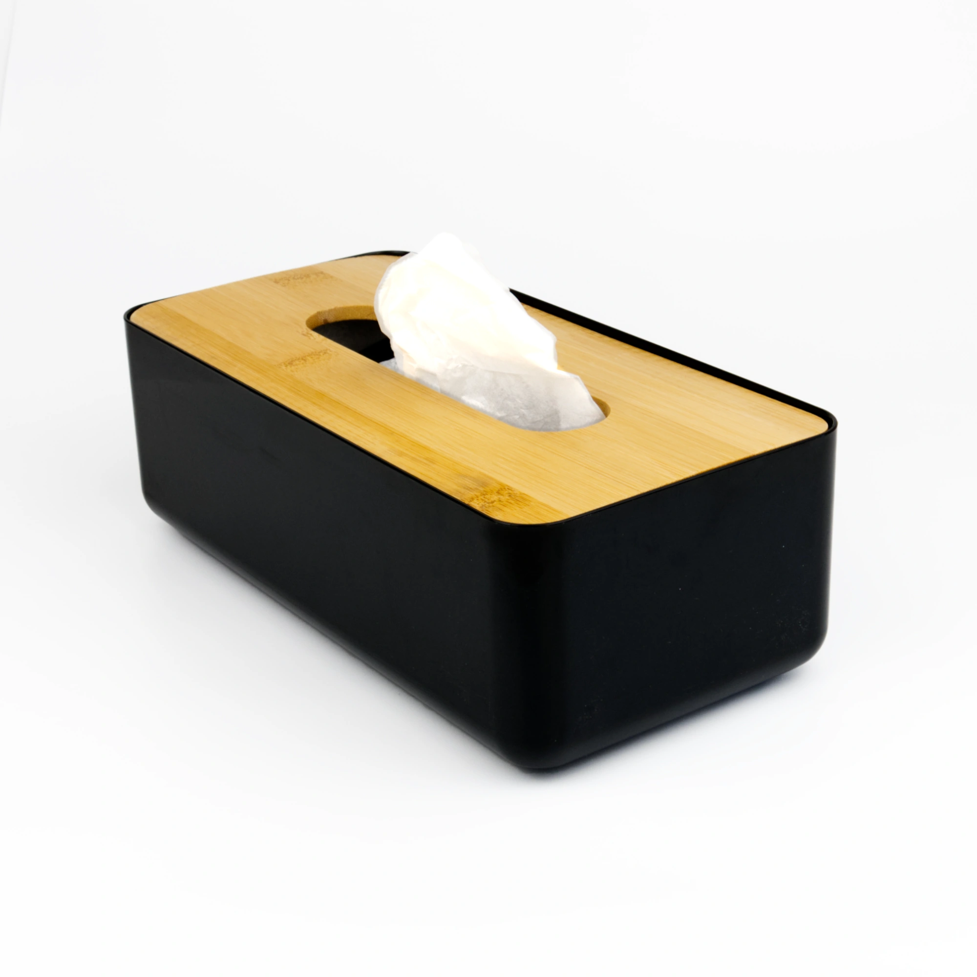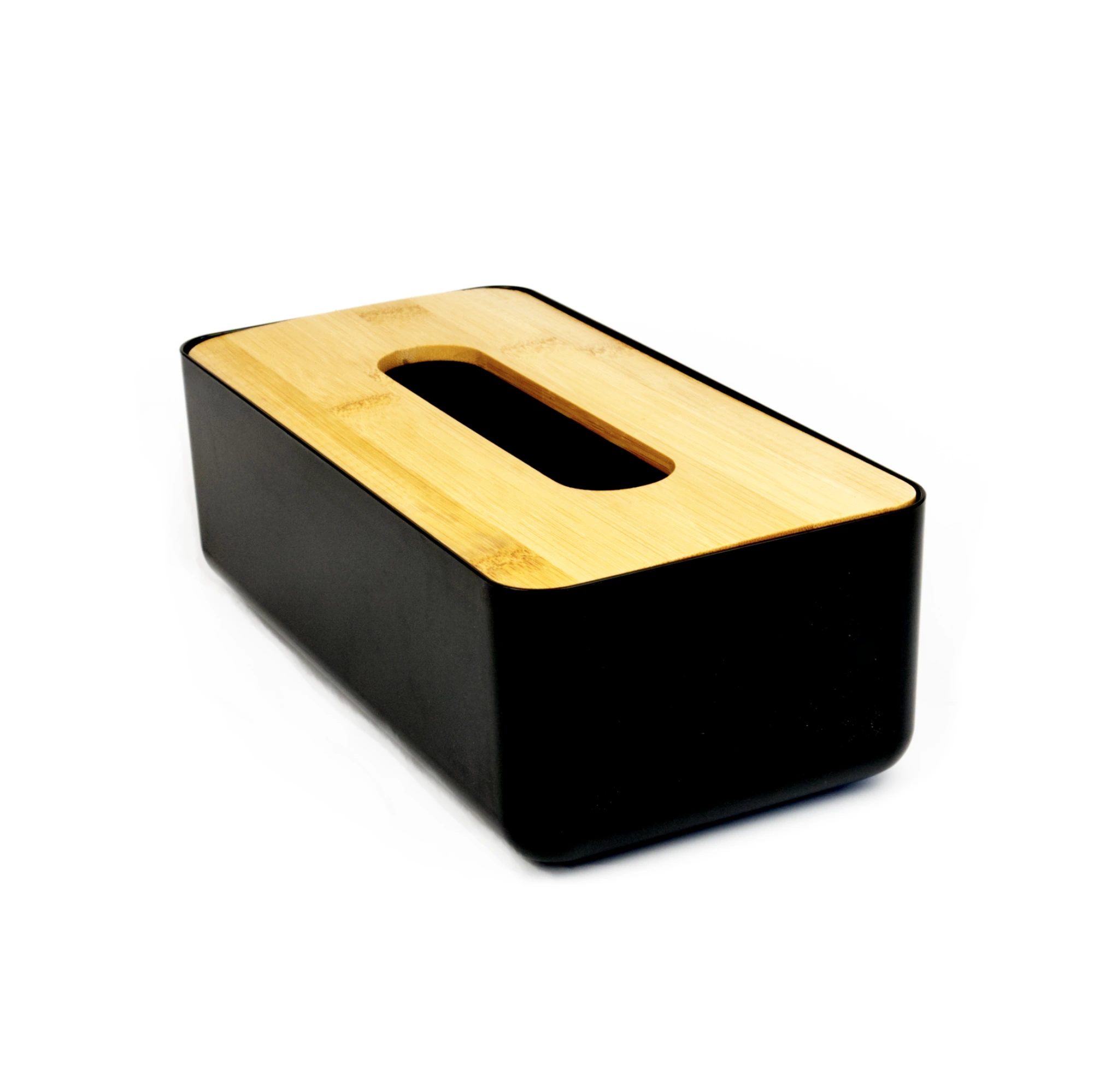 Eleganta salvešu kaste ar bambusa vāku un stilīgu melnu korpusu. Ideāla praktiska un estētiska detaļa jebkurai telpai – vannasistabai, viesistabai vai birojam.