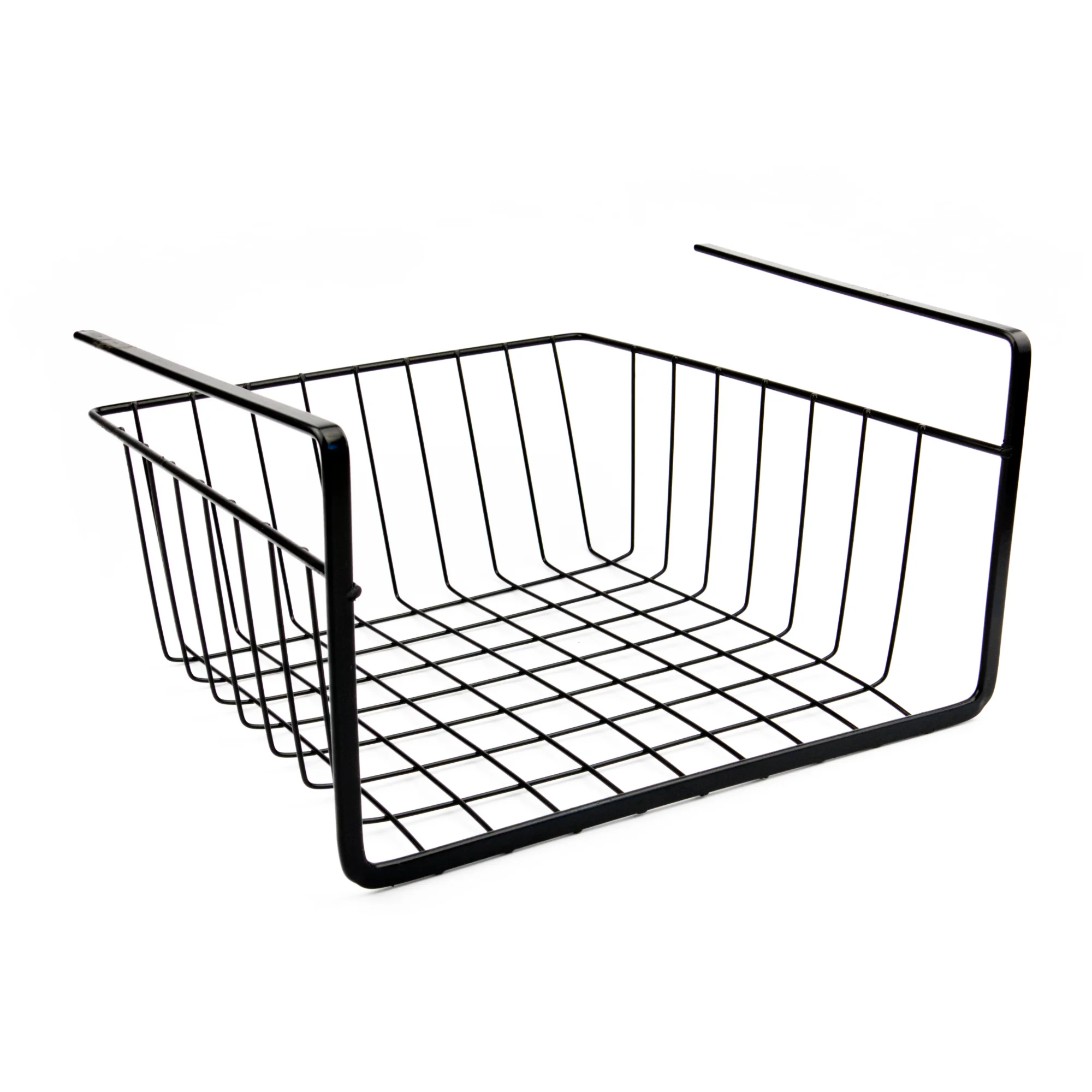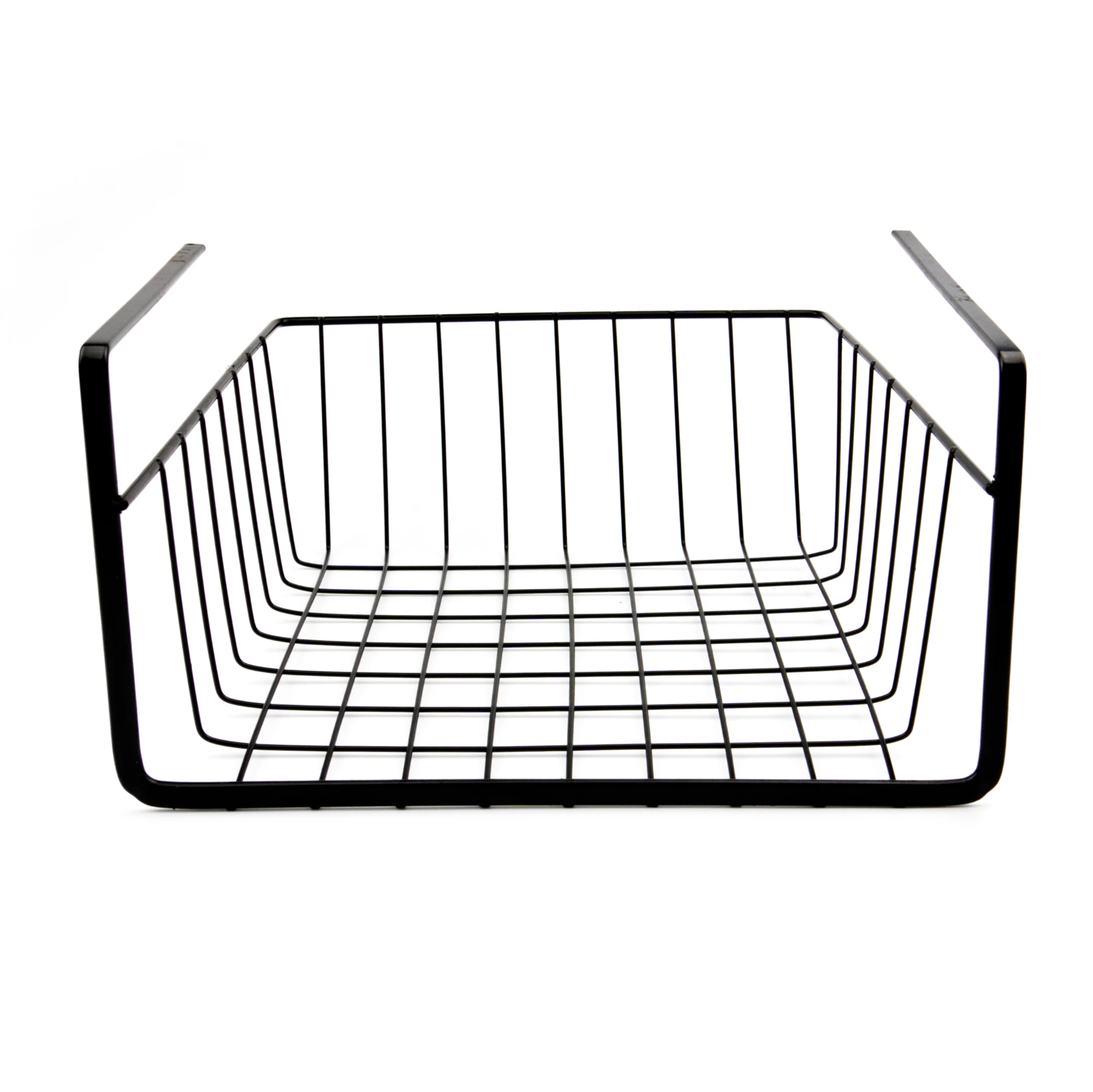 Piekaramais stiepļu plaukts no melna metāla (26×14×26 cm) – ērti uzkarināms uz plaukta malas. Praktisks stiepļu plaukts papildu glabāšanas vietai mājās vai birojā.