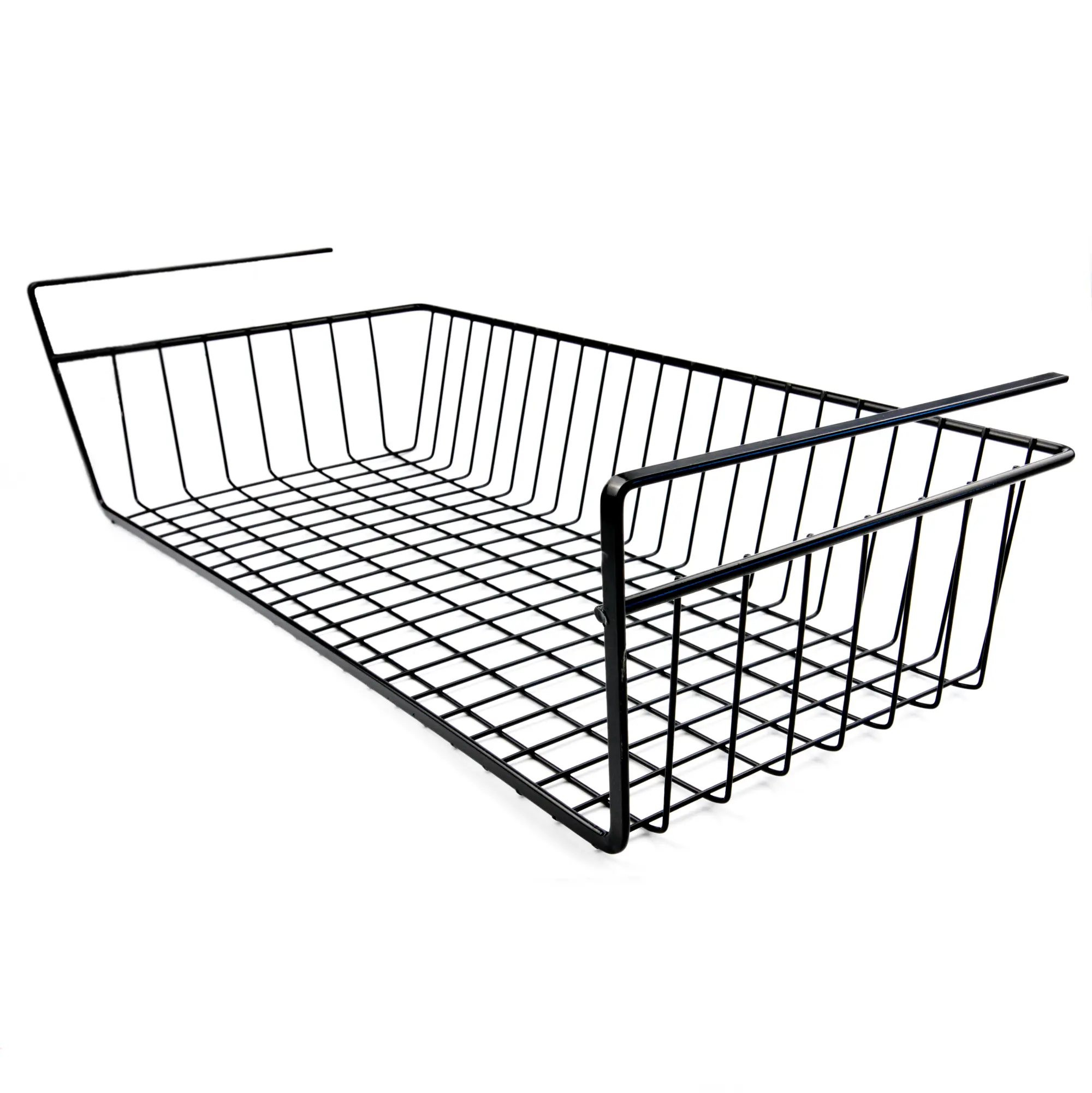 Piekarināms stiepļu plaukts melnā krāsā (56×26×14 cm) – ērti uzkarināms zem plaukta. Praktisks un stilīgs glabāšanai bez urbšanas.