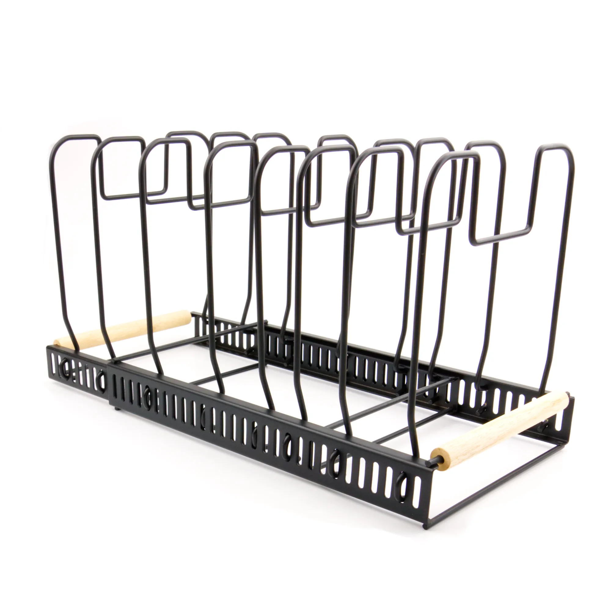 Regulējams pannas, vāku un katlu turētājs ar dabīga koka rokturiem ir radīts, lai ieviestu kārtību, ērtību un pārskatāmību virtuvē. Metāla statīvs ar melnu pārklājumu ir ne tikai vizuāli pievilcīgs, bet arī izturīgs un ilgmūžīgs. Pateicoties 8 noņemamiem nodalījumiem, turētāju var ērti pielāgot dažāda izmēra pannām, katliem un vākiem. Turklāt tā garumu iespējams regulēt no 32,5 līdz pat 58,5 cm – ideāli, lai pielāgotos plaukta vai atvilktnes platumam.