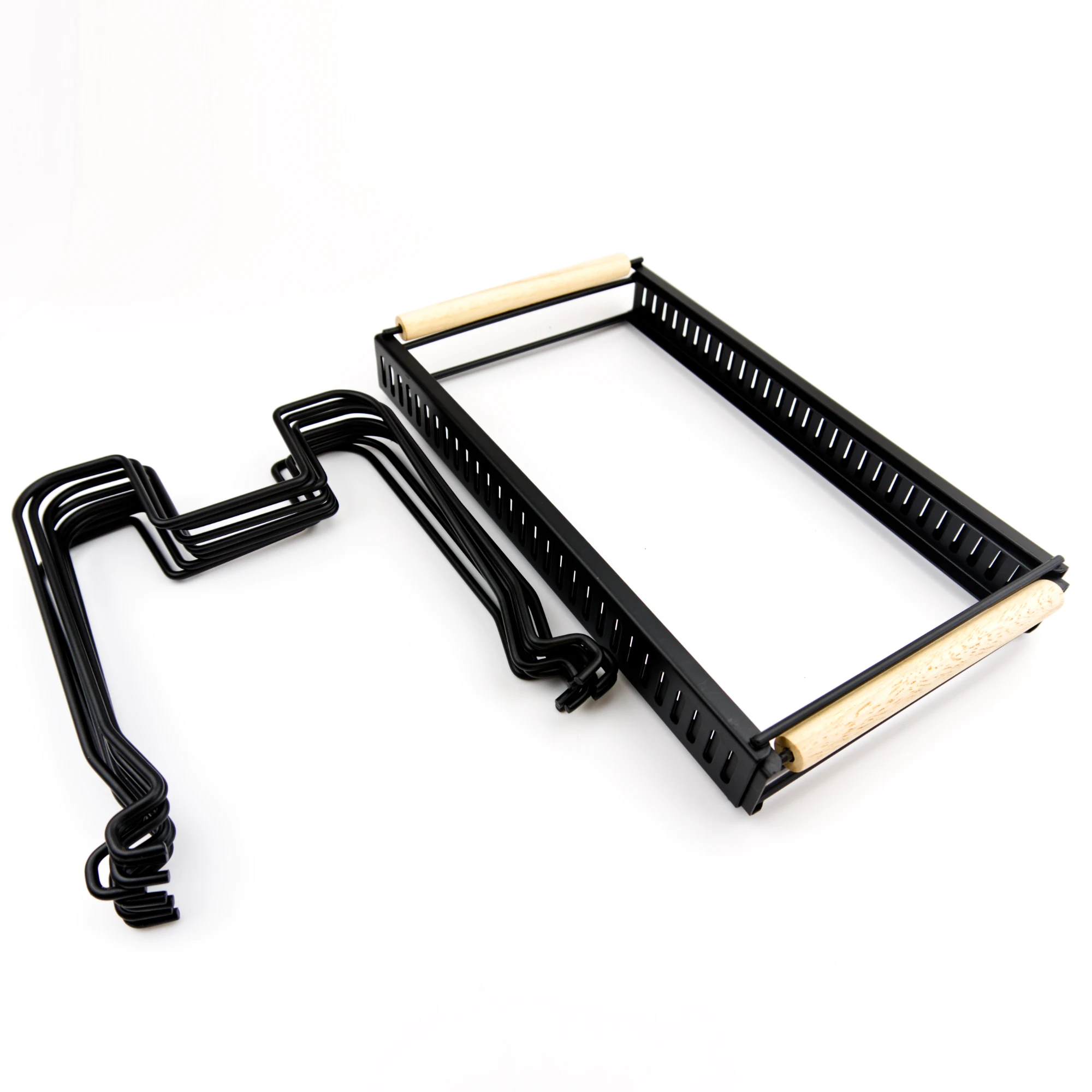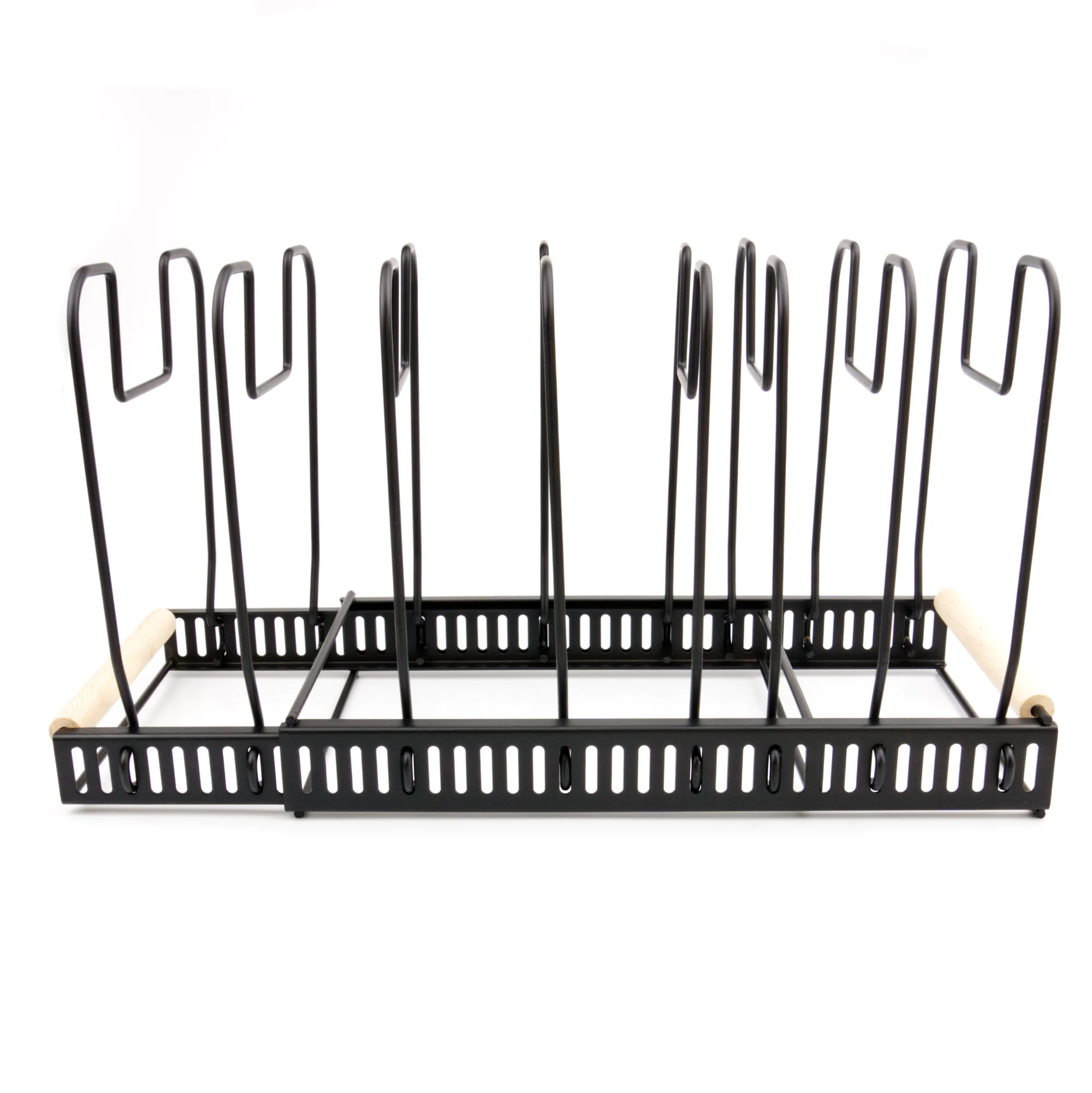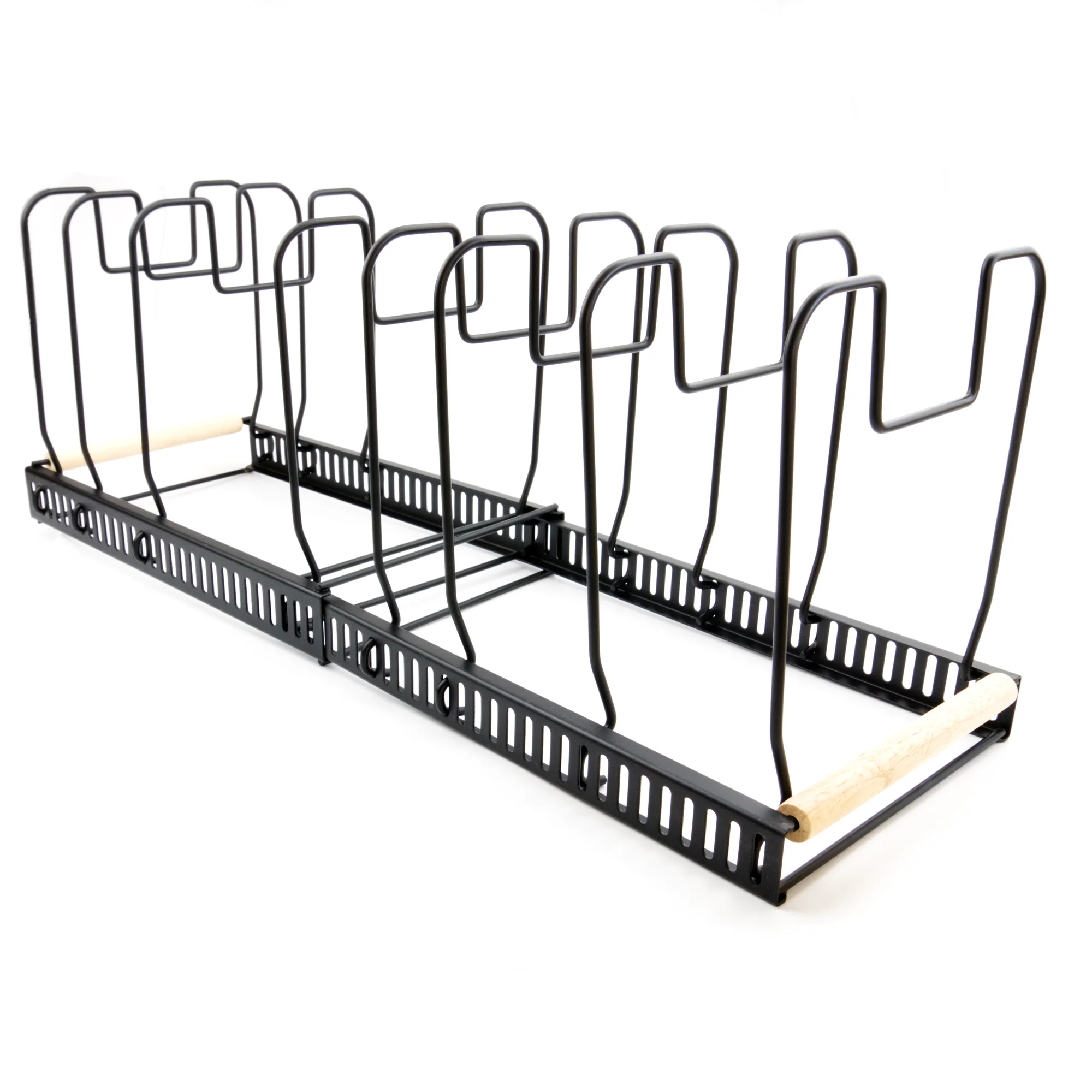 Regulējams pannas un katlu turētājs ar metāla konstrukciju un koka rokturiem – ideāli piemērots katliem, pannām un vākiem. Platumu iespējams pielāgot no 32,5 līdz 58,5 cm, padarot šo regulējamo pannas un katlu turētāju par praktisku risinājumu jebkurai virtuvei.