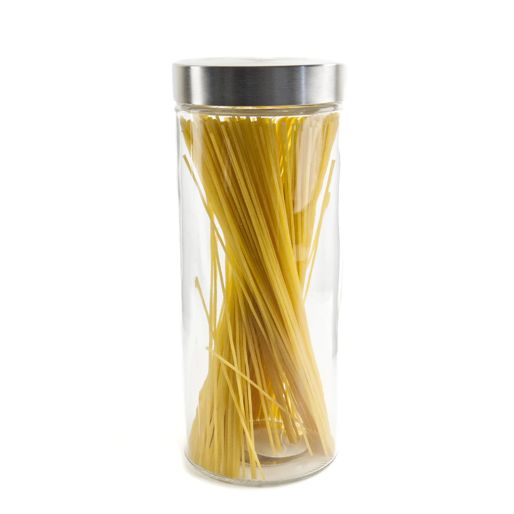 Izturīga stikla burka ar vāku no nerūsējošā tērauda – ideāli piemērota makaronu, graudu, sēklu vai citu sausās pārtikas produktu glabāšanai.