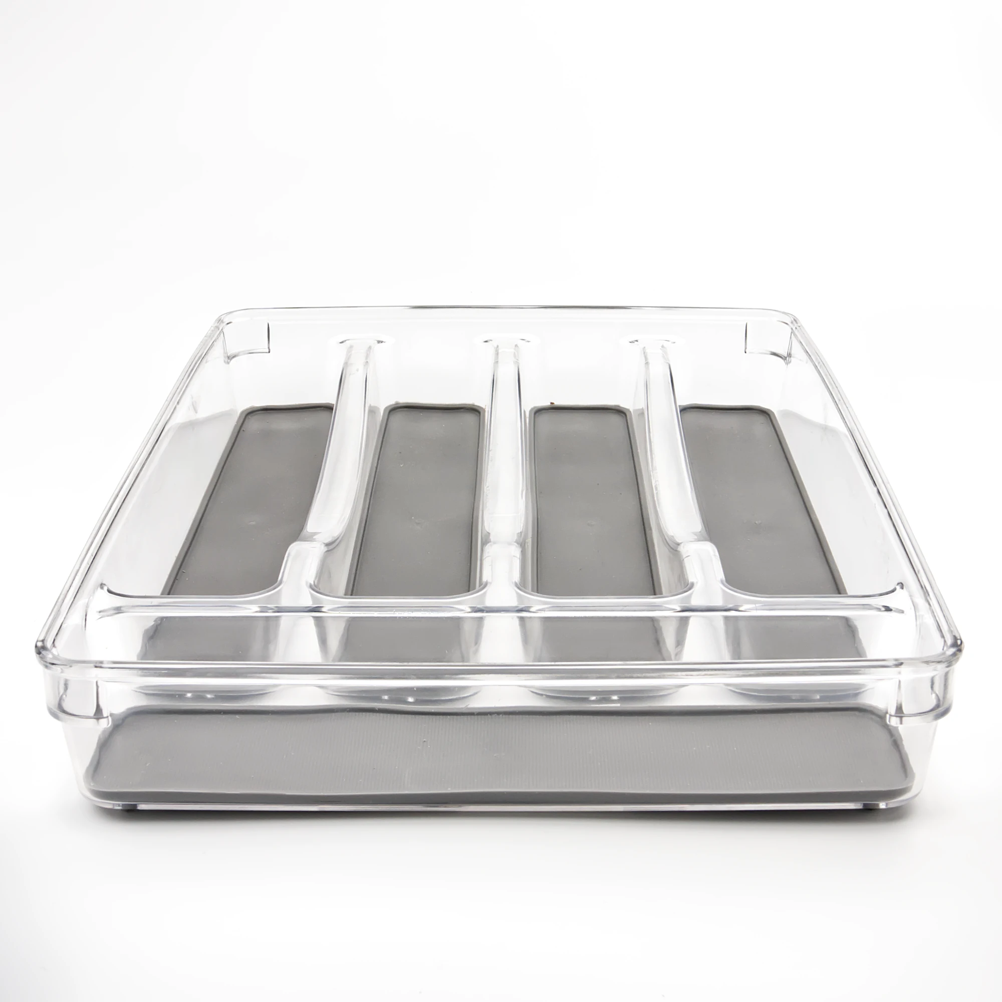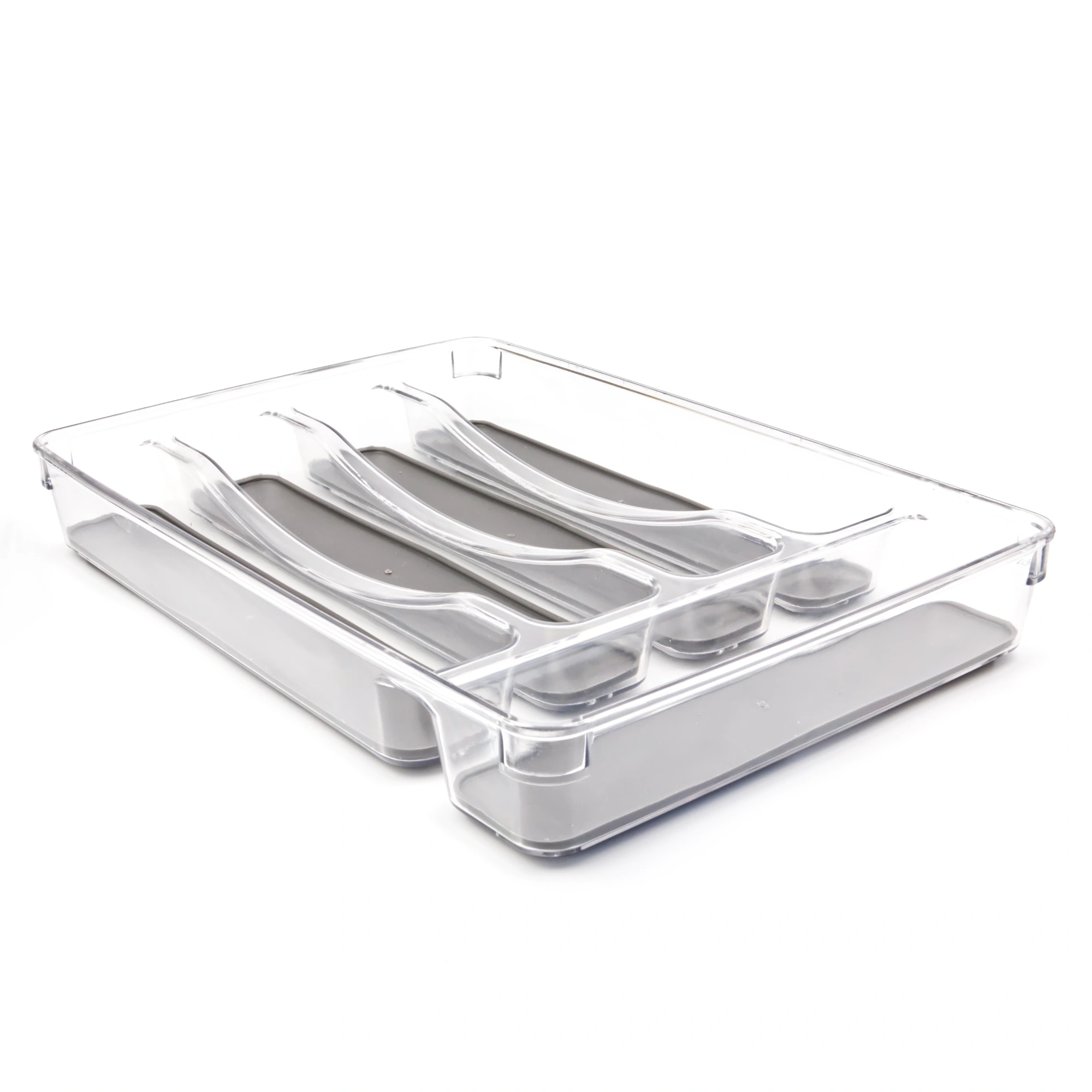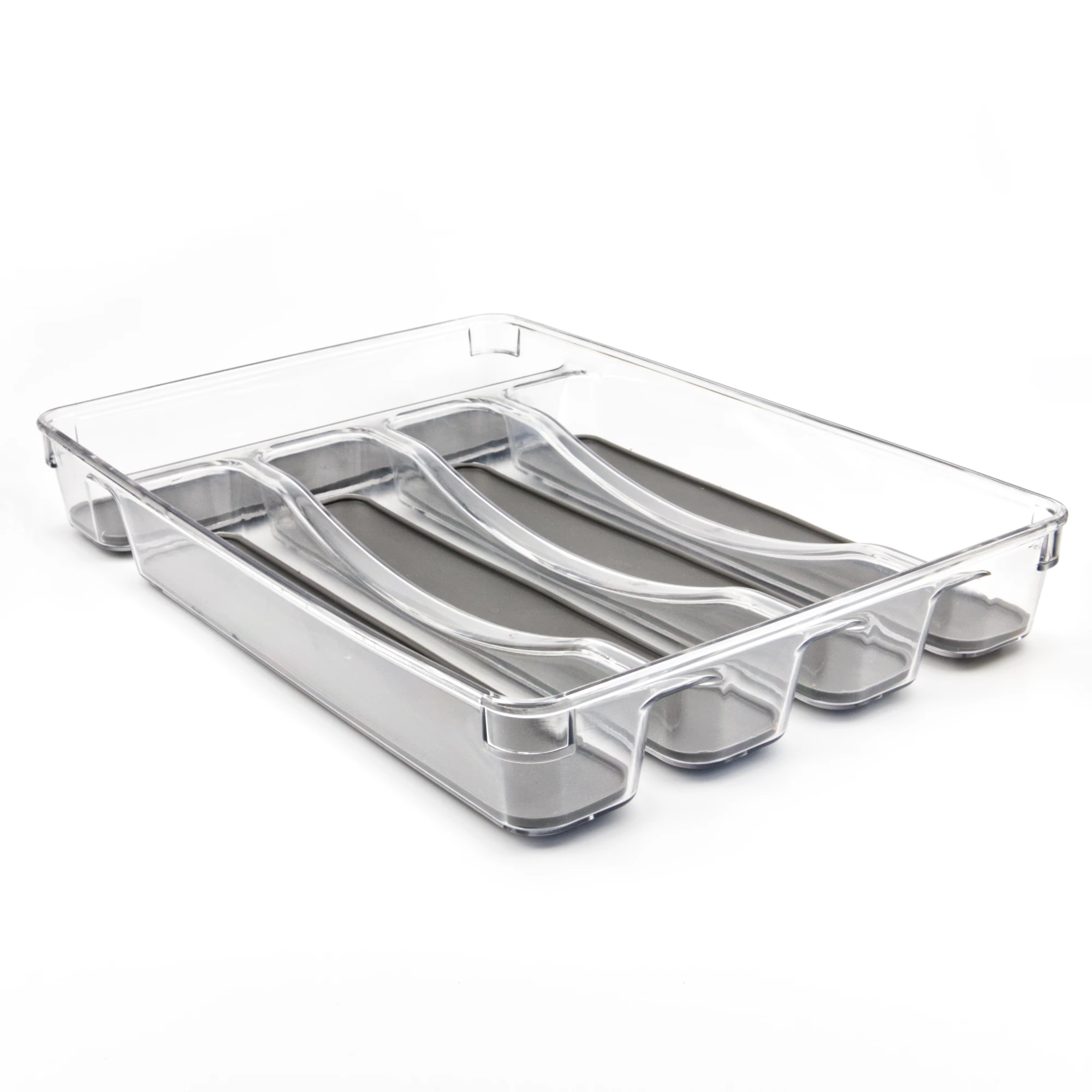 Galda piederumu organizators ar 5 nodalījumiem - palīdzēs ieviest kārtību virtuvē. Šis ieliktnis ir izgatavots no izturīgas, caurspīdīgas PET plastmasas ar tumši pelēku neslīdošu pamatni, kas nodrošina, lai dakšas, karotes, naži un citi piederumi paliek savā vietā arī tad, kad atvilktne tiek atvērta vai aizvērta.